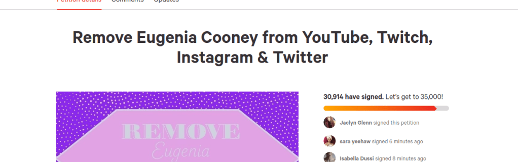 (…) It is for this reason that we ask YouTube, Twitch, Twitter and Instagram to step in and to take an active role in temporarily removing Eugenia from said platforms while she receives the help that she so desperately needs. Many people are afraid that Eugenia will pass away before she is able to receive treatment. By removing Eugenia from these platforms, she will no longer be bombarded with comments regarding her low weight, which only seem to encourage her eating disorder.