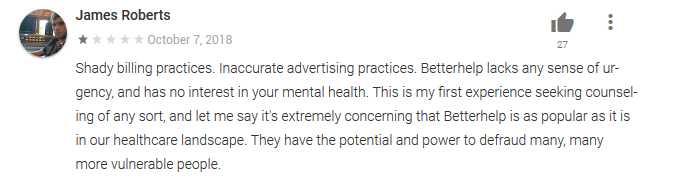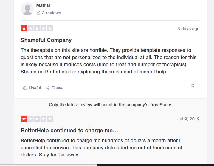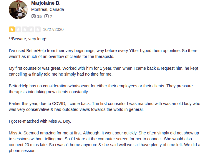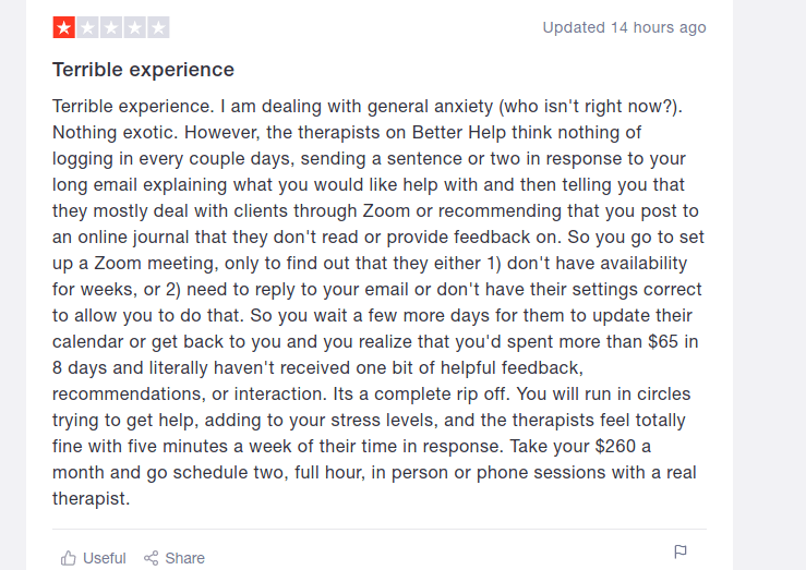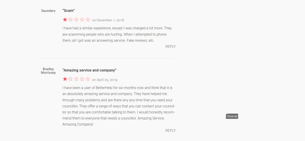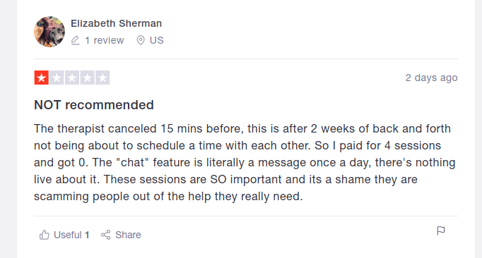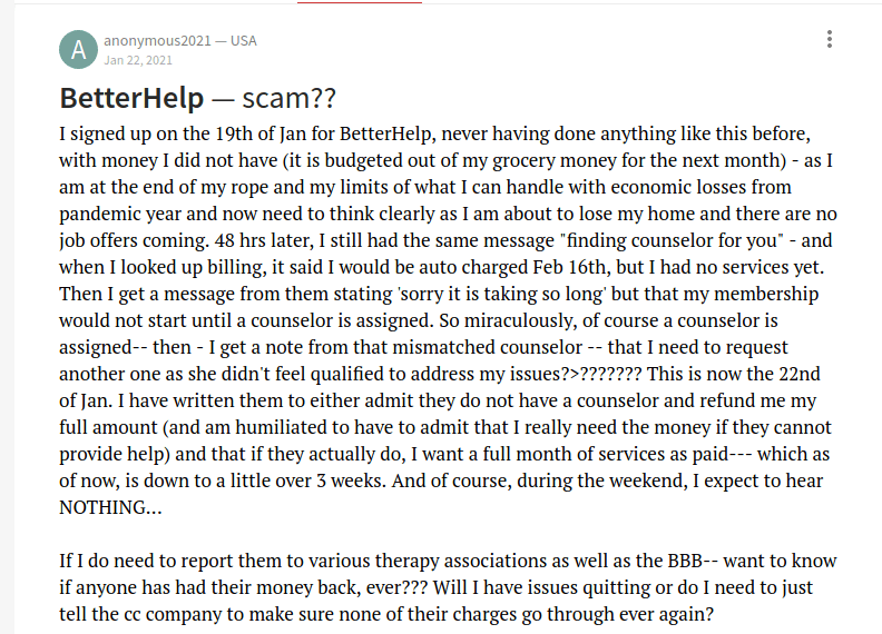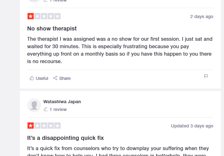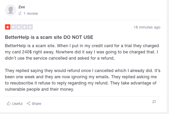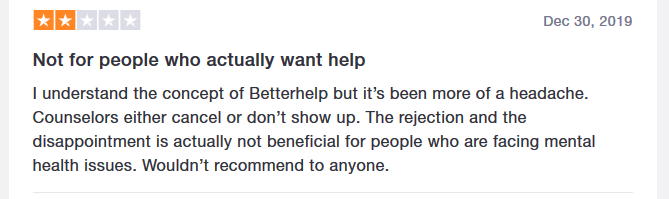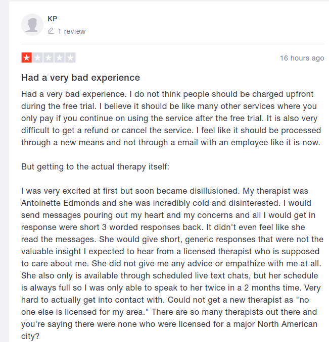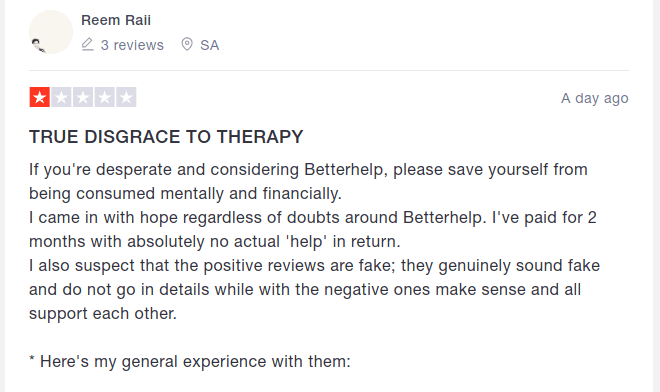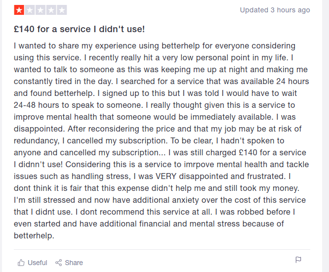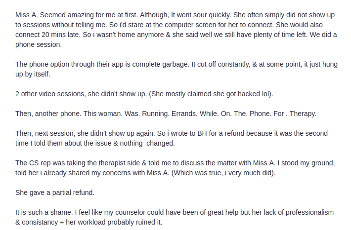 Sadly, for some, BetterHelp was their first experience of therapy (even when it clearly isn’t therapy at all). Ergo the reviews stating it had taken a lot of courage to seek help in the first place, only to be rejected abruptly or scammed, or both. And to those mentioning the experience, it had been too disappointing to seek help again.