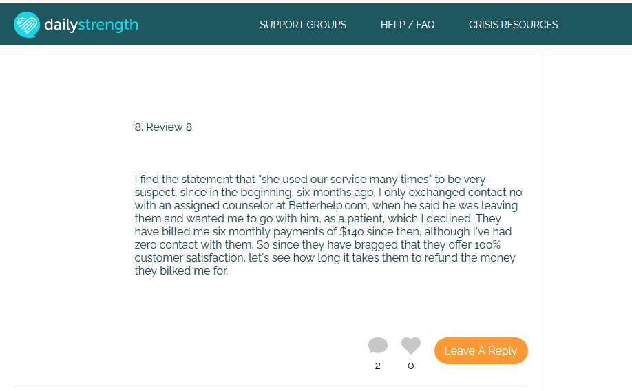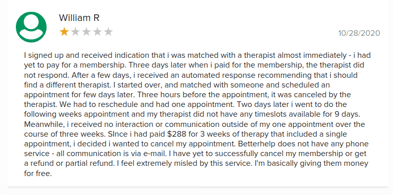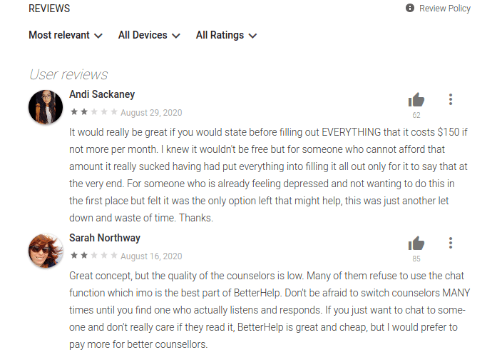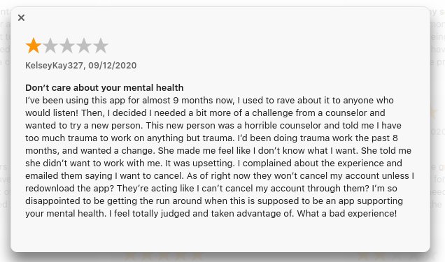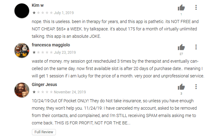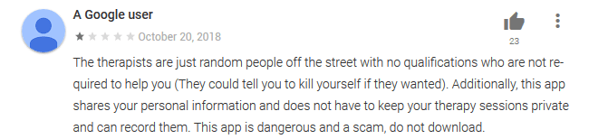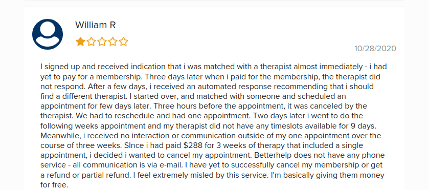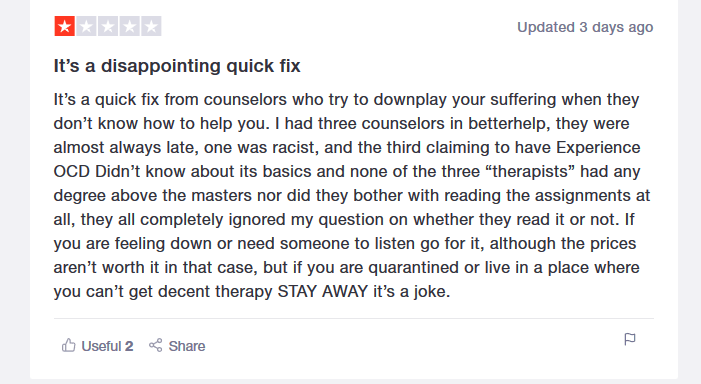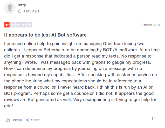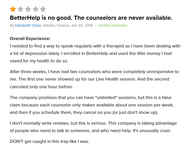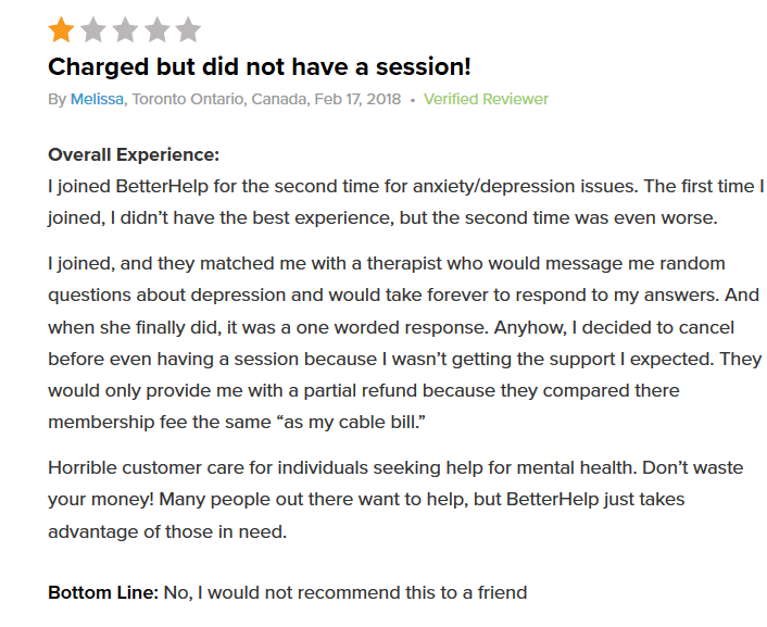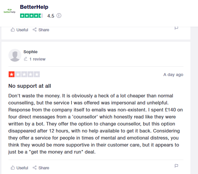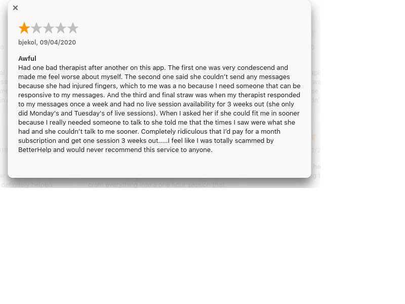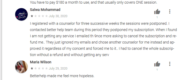 Sadly, for some, BetterHelp was their first experience of therapy (even when it clearly isn’t therapy at all). Ergo the reviews stating it had taken a lot of courage to seek help in the first place, only to be rejected abruptly or scammed, or both. And to those mentioning the experience, it had been too disappointing to seek help again.