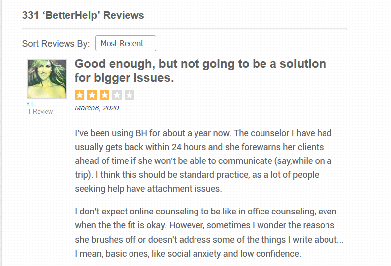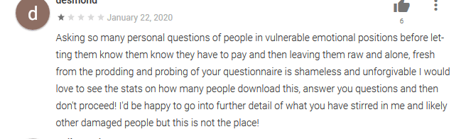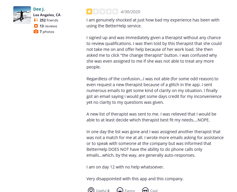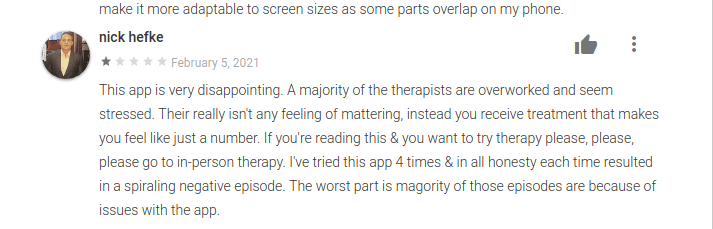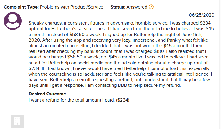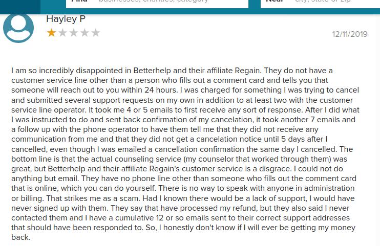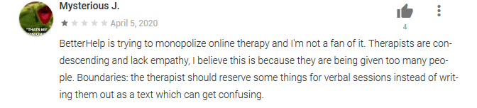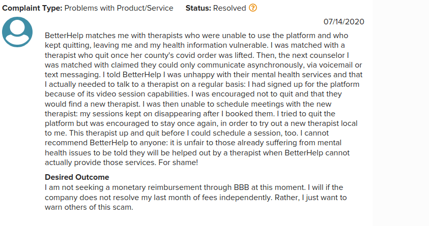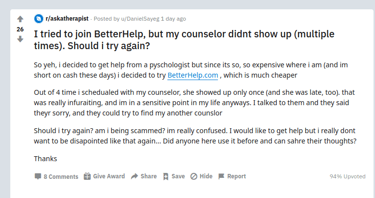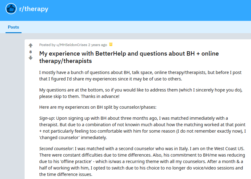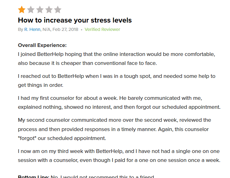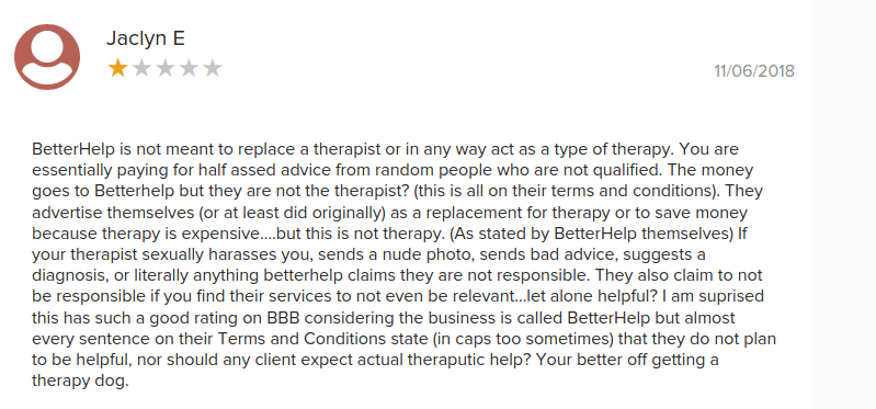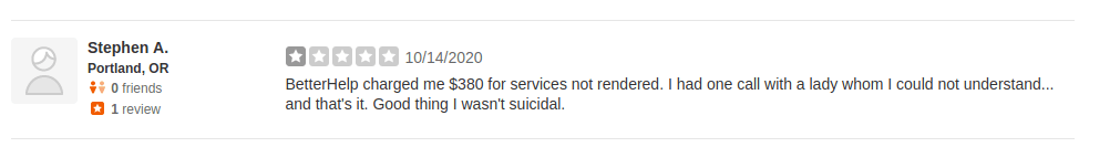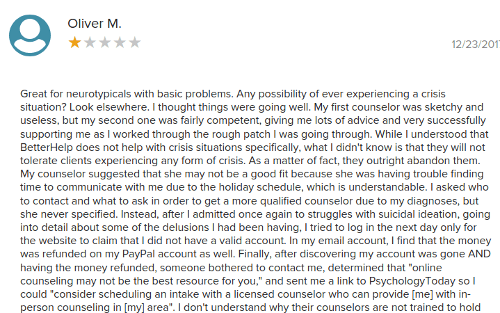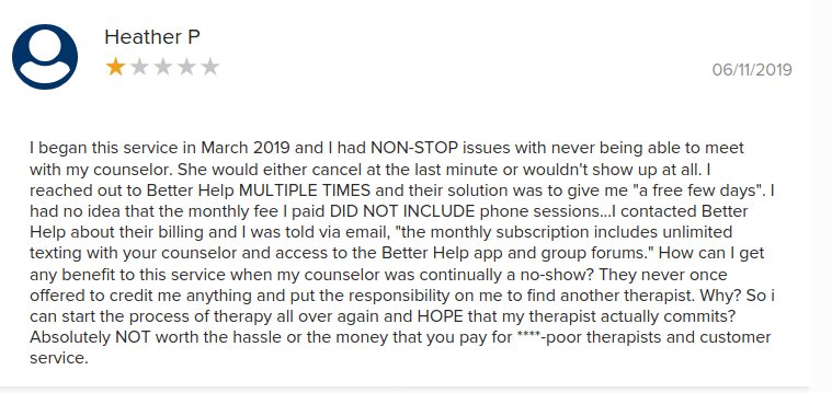 Sadly, for some, BetterHelp was their first experience of therapy (even when it clearly isn’t therapy at all). Ergo the reviews stating it had taken a lot of courage to seek help in the first place, only to be rejected abruptly or scammed, or both. And to those mentioning the experience, it had been too disappointing to seek help again.
