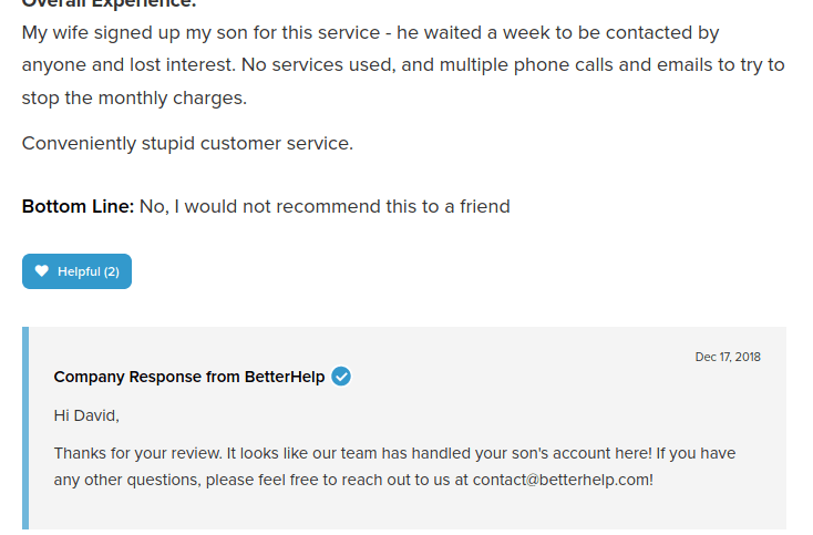 As mentioned above, many people end up posting negative reviews and filing complaints after customer service is unresponsive or unhelpful. The only phone number they are given is that of a third party which in turn emails BetterHelp, which is useless, as clients can do so themselves (often to no avail). There is no way to reach the company directly, even for urgent matters, such as overcharging. (SS)