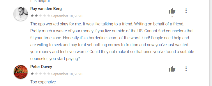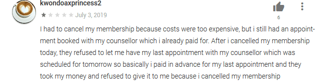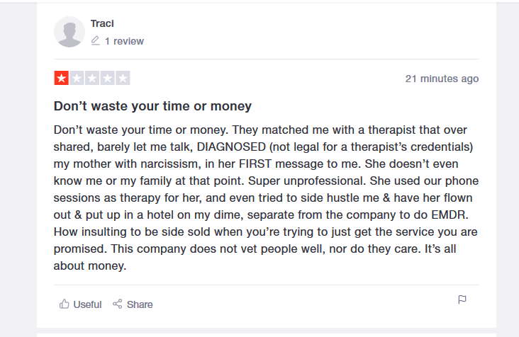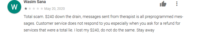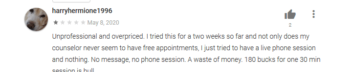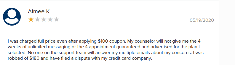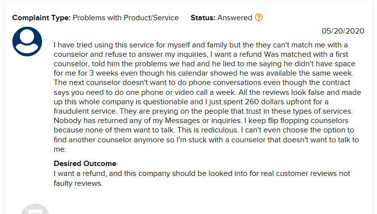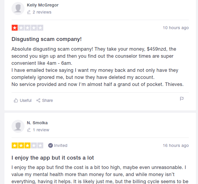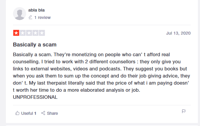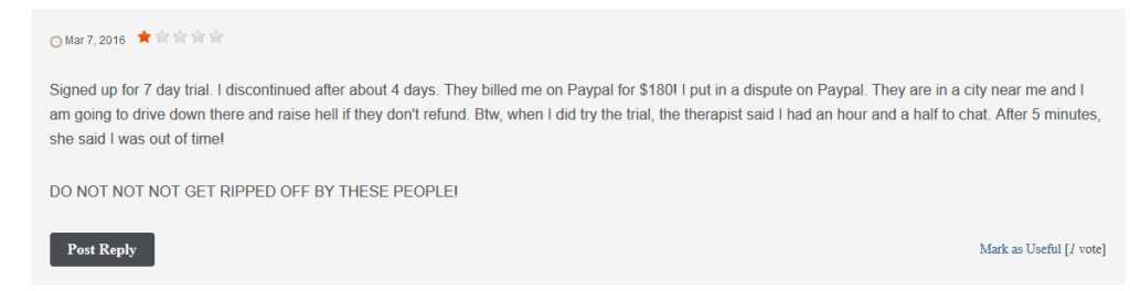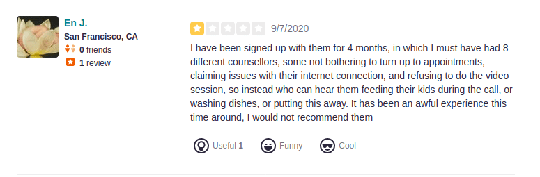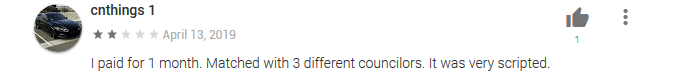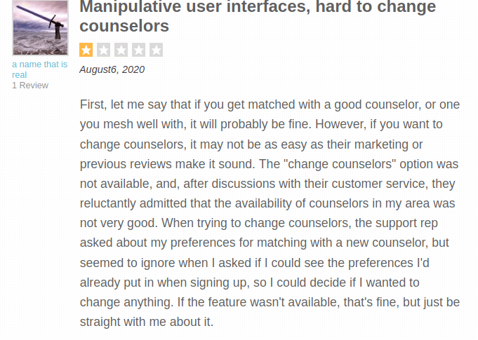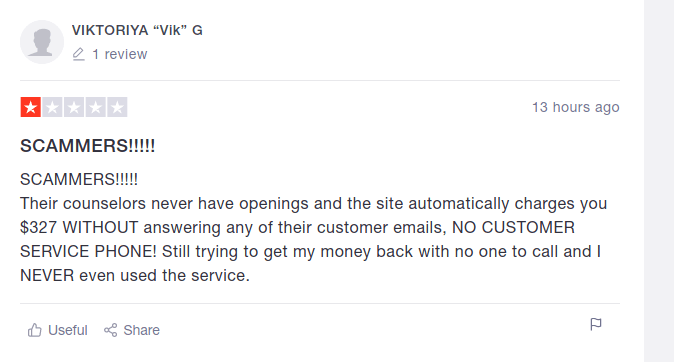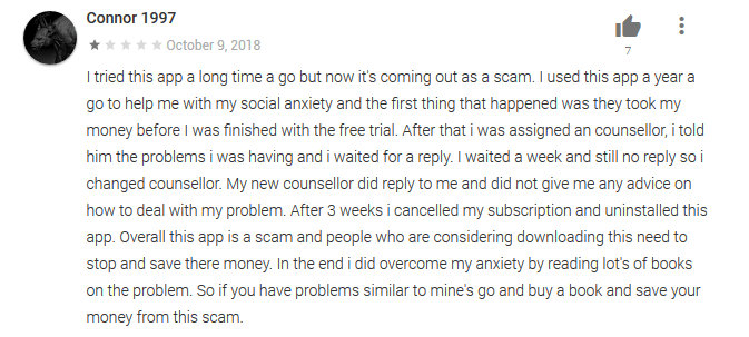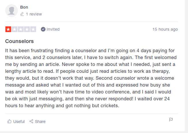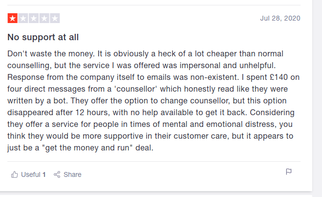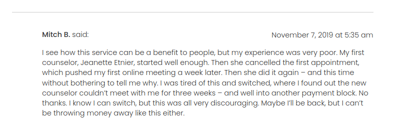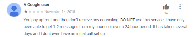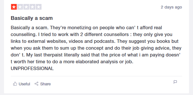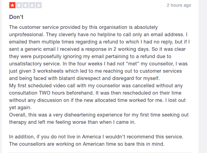 Every reviewer claiming to be delighted with their counsellor after having gone through several before is essentially claiming to be glad they wasted weeks, potentially months, paying for nothing. Is that realistic? I don’t think so. Does that sound like these people were in need of immediate help and low on funds, like most people are when turning to this company, or likely fake reviewers? It’s incredibly counter-intuitive that anyone would keep trying to use a service after being repeatedly disappointed.