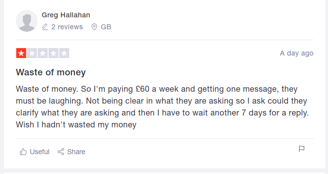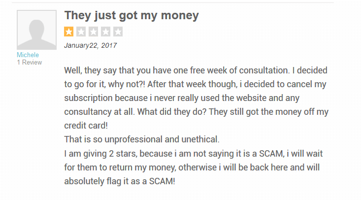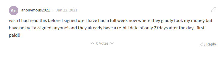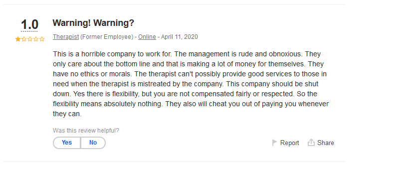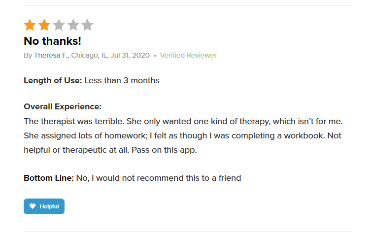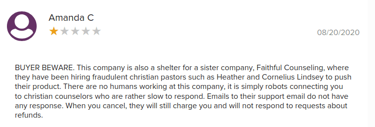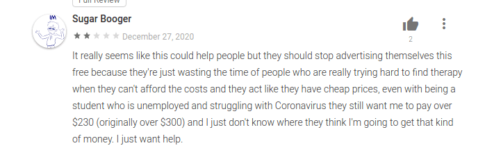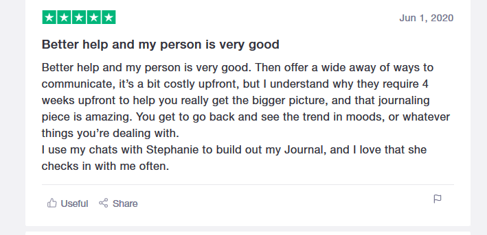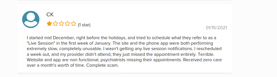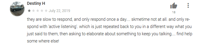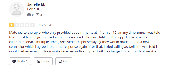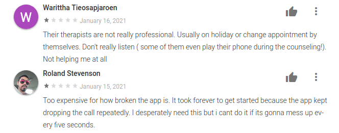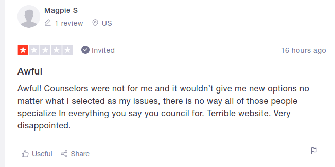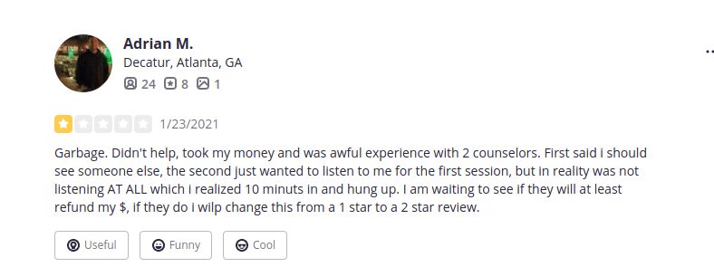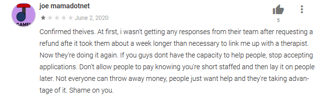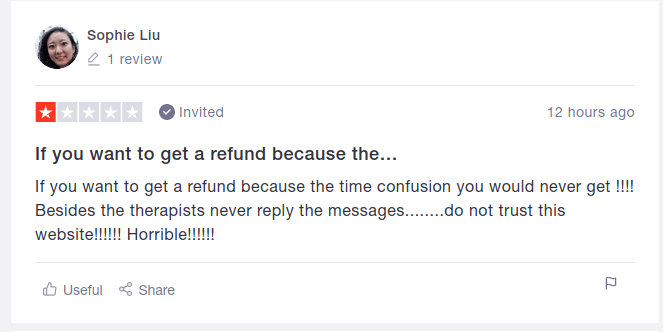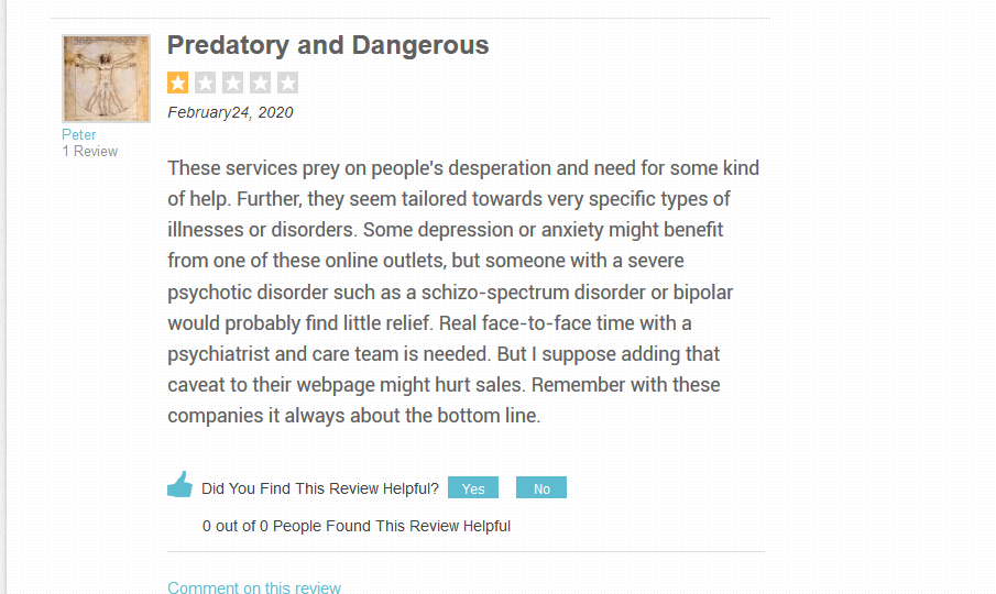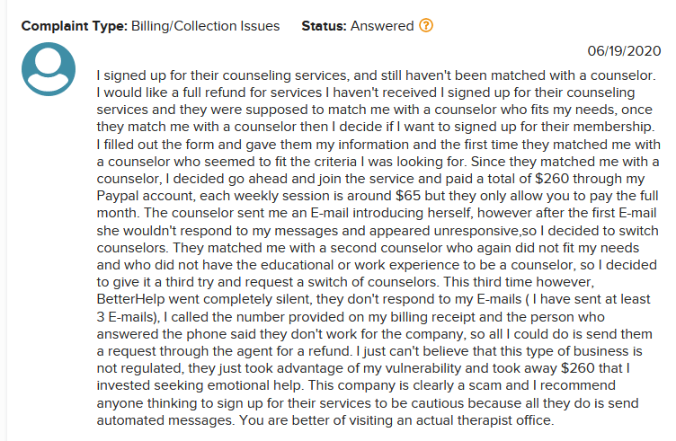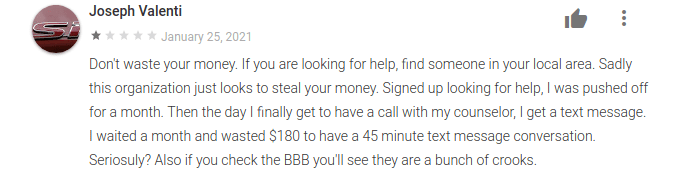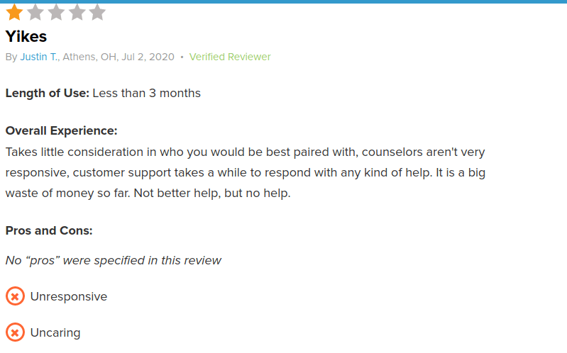 Every reviewer claiming to be delighted with their counsellor after having gone through several before is essentially claiming to be glad they wasted weeks, potentially months, paying for nothing. Is that realistic? I don’t think so. Does that sound like these people were in need of immediate help and low on funds, like most people are when turning to this company, or likely fake reviewers? It’s incredibly counter-intuitive that anyone would keep trying to use a service after being repeatedly disappointed.