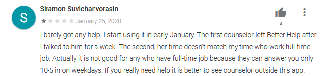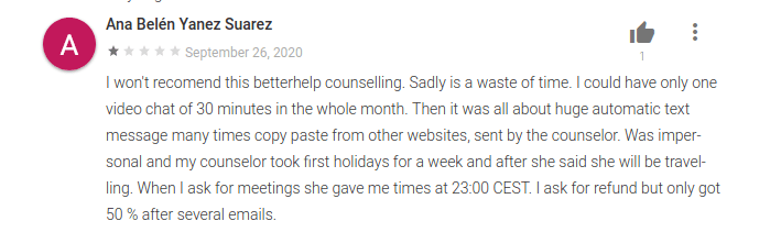 • Outside the US, there are usually difficulties in terms of communicating with the counsellor due to time zone differences. Nonetheless, BetterHelp advertises internationally, as a reliable service. Many people became aware, after having already paid, that it would be impossible for them to conduct any sessions at reasonable times.