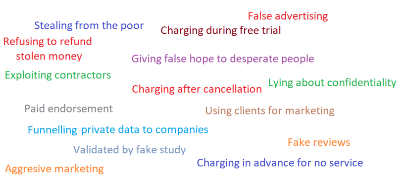 • Falsely advertising the product or service offered, whilst ensuring the TOS disclaim any responsibility towards the customer, should the product or service be radically different than advertised (even completely useless).