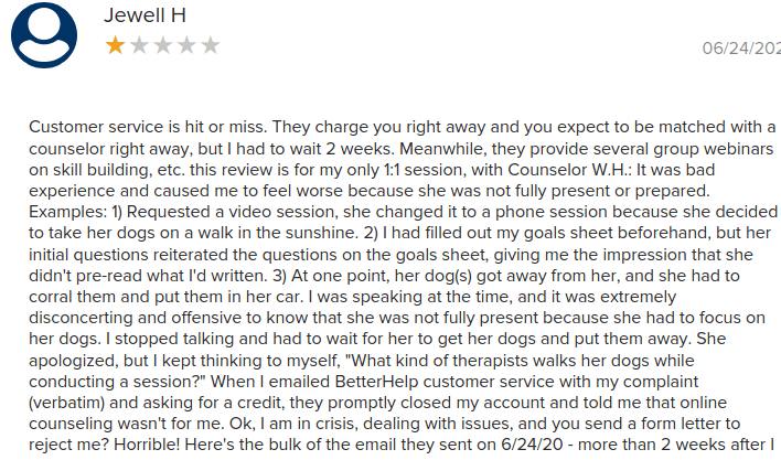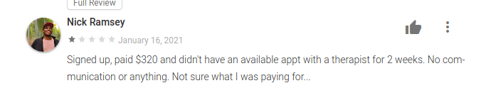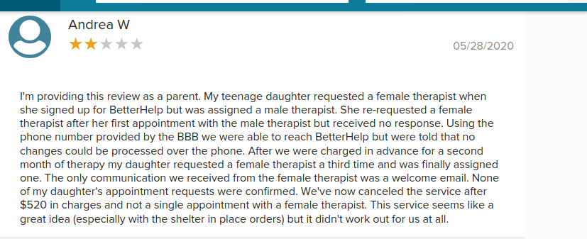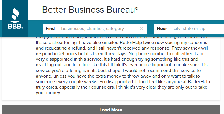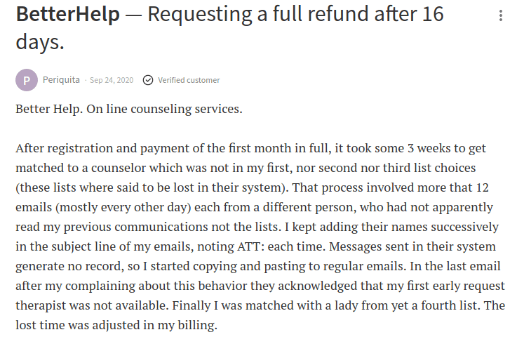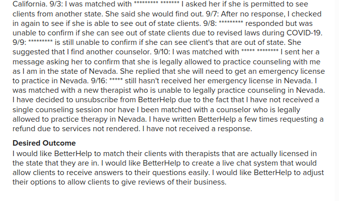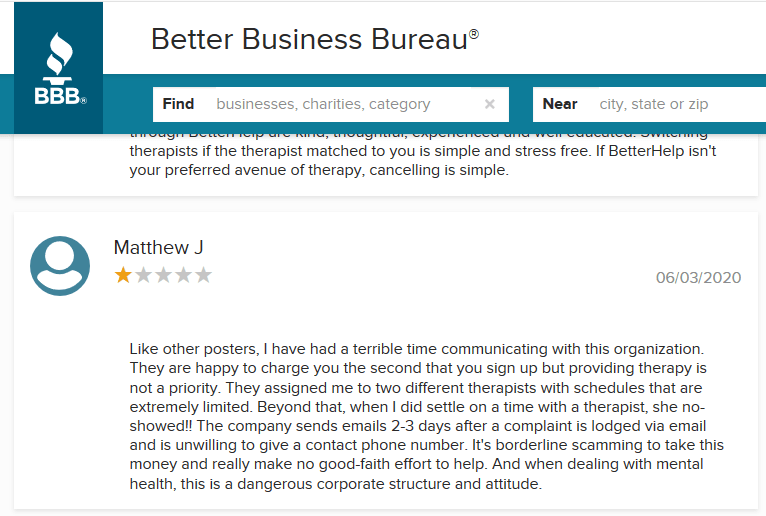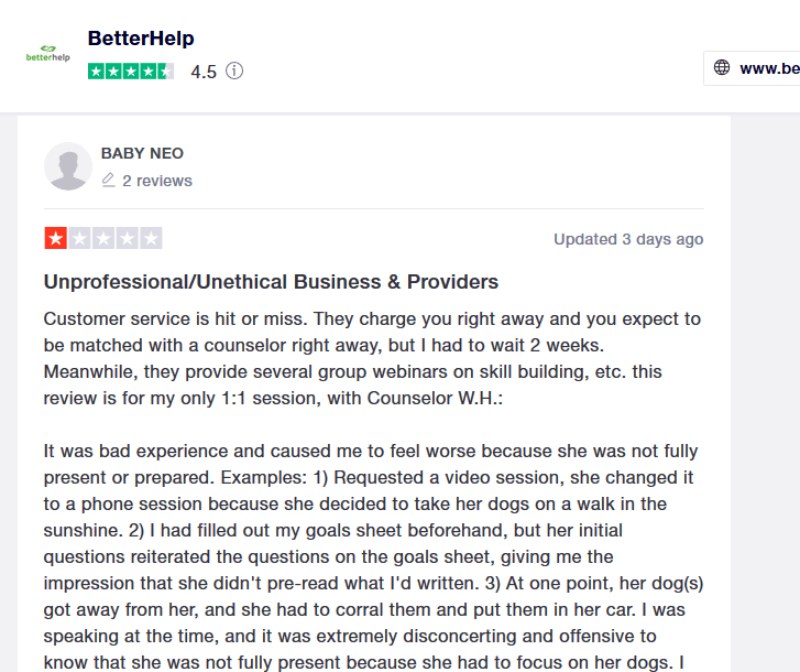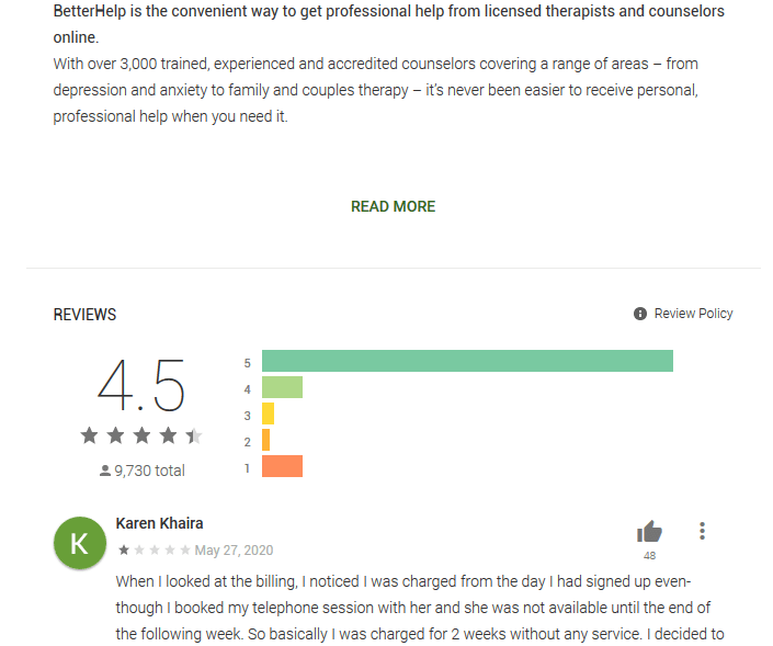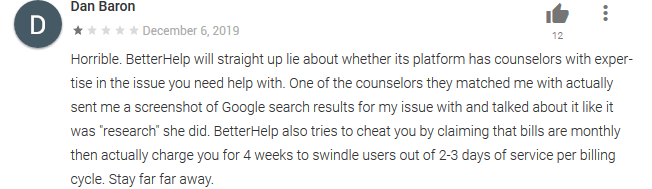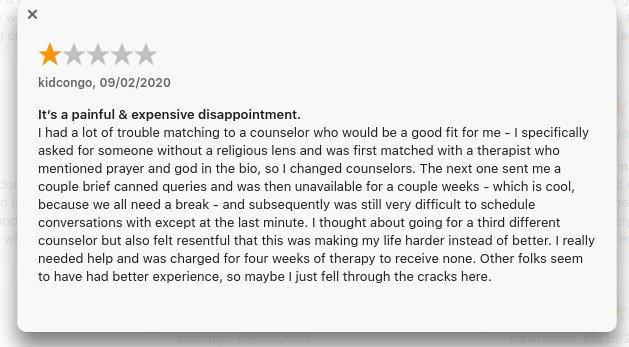 Lying regarding the step required to charge someone (being matched with a counsellor). BetterHelp’s adverts state one is not charged before being assigned a counsellor, and people tend to take that at face value. Nowadays it seems this has become less of an expectation, since people are known to wait for up to two weeks, after paying, with still no match. Of course being immediately matched, as mentioned above, doesn’t mean that particular counsellor is available (or even working there anymore). Either way, this is still mentioned on their site and is just another lie.