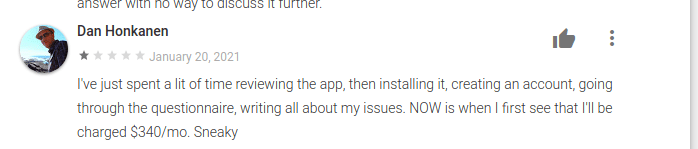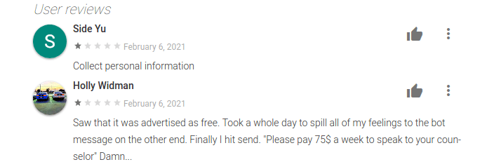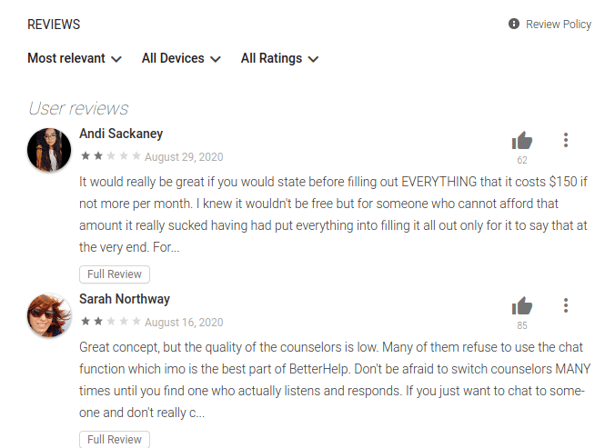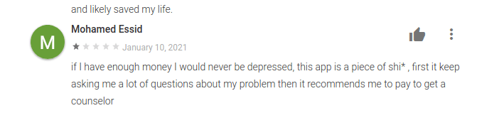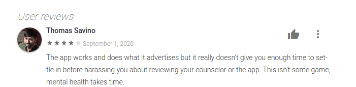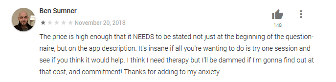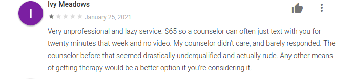 As mentioned above, BetterHelp largely targets people who cannot afford, or think they cannot afford in person therapy. This is being flaunted as a major advantage, “making therapy accessible for everyone” (as shown above, they do not even provide therapy). You will find rows upon rows of positive reviews assuring you that you can switch counsellors at any time, should you not be happy with their matching service.
