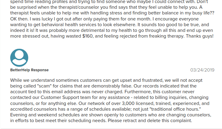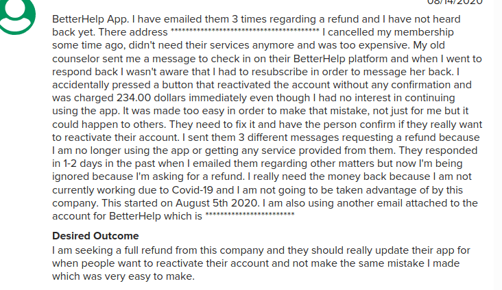 BetterHelp does not, in fact, delete the details of former subscribers. Everything is kept, including payment information, as mentioned by people who complained on BBB that they were simply looking at the website after having used it previously, and were automatically re-subscribed (and immediately charged) by clicking on a button which did not indicate this would happen. Someone else complained they had used the platform years prior, signed up again and could not clear their old details, which no longer fit their situation, and were evaluated according to those. Hence when the company claims to have lost access to someone’s details, they are almost definitely lying.