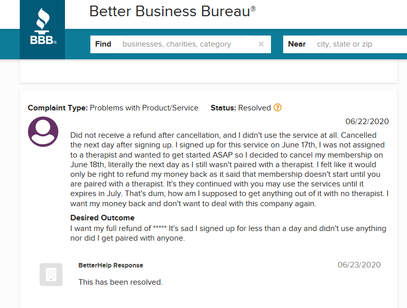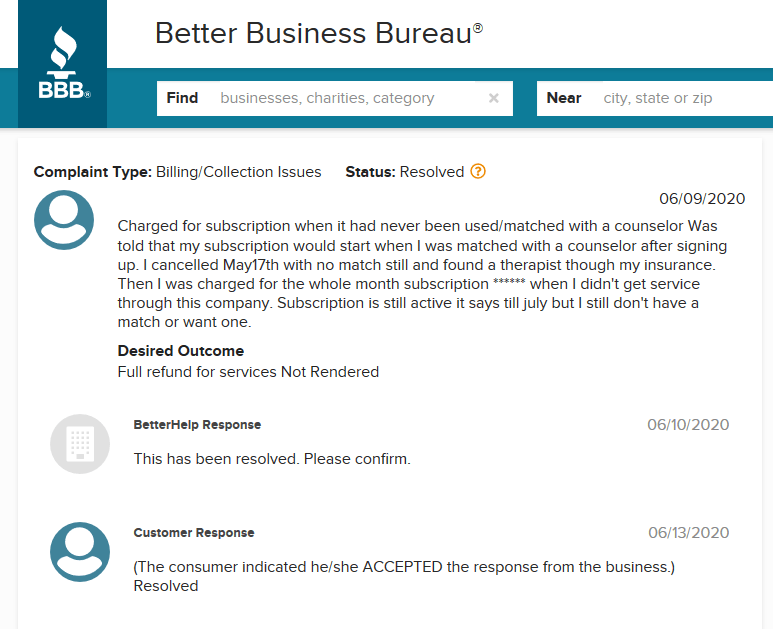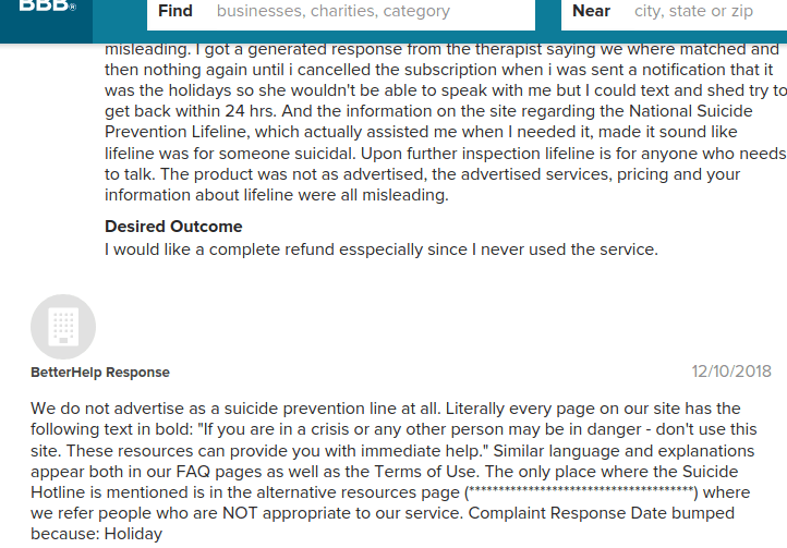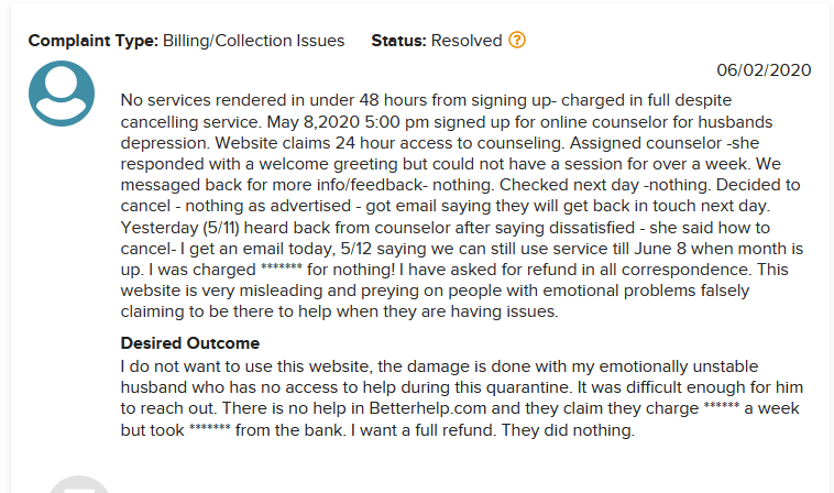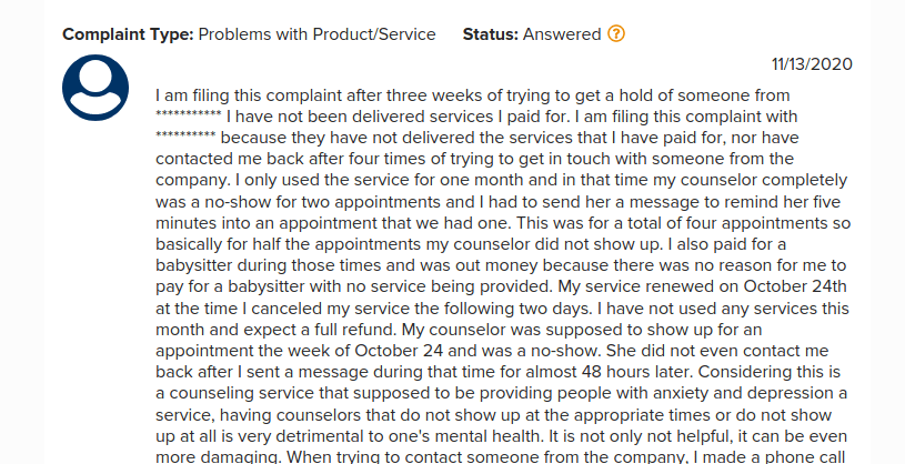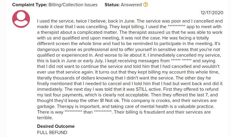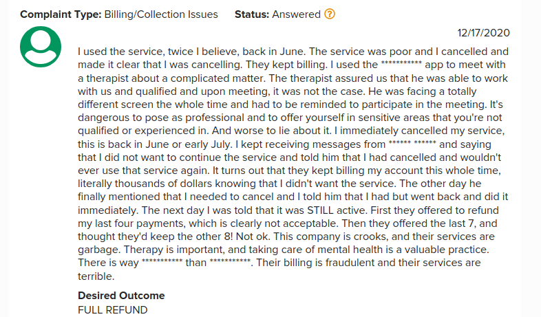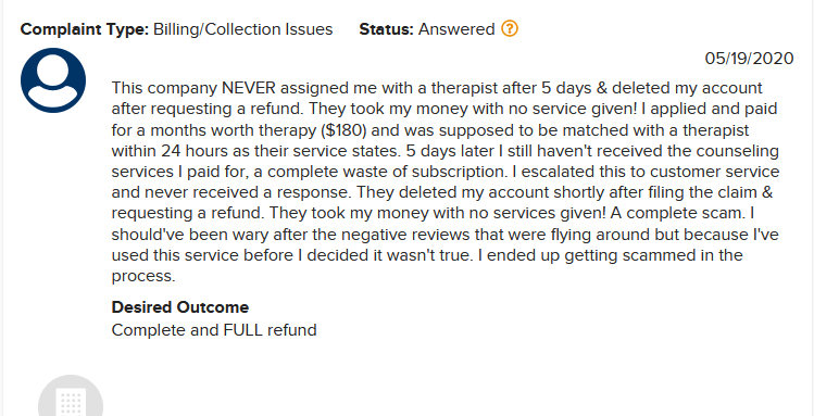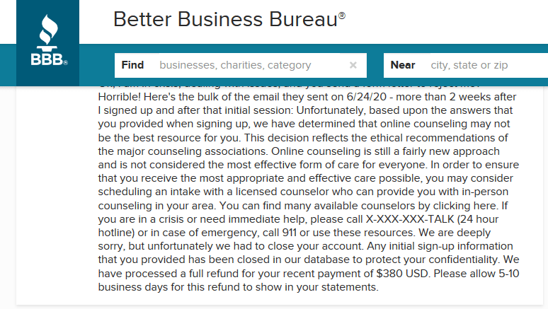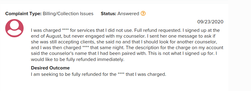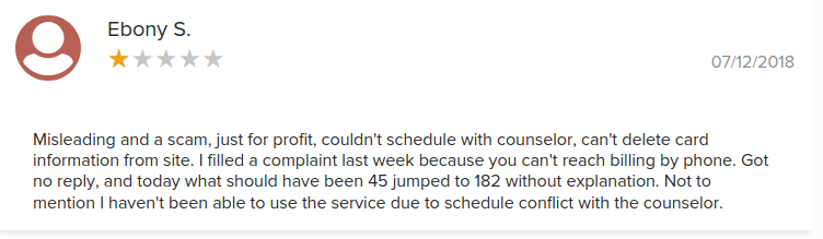Charging and denying service (closing a client’s account abruptly), at times without refunding immediately. A number of times, as described in reviews, clients were not immediately declined service, but were charged in advance, matched with a counsellor and subsequently had their account deleted from the website without warning, some turning to BBB for refunds (which is incredibly common since customer service tends to ignore people for days on end).