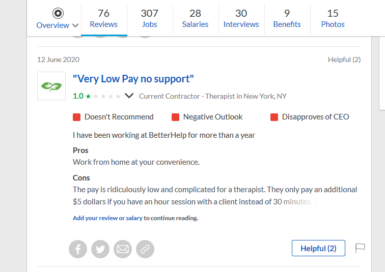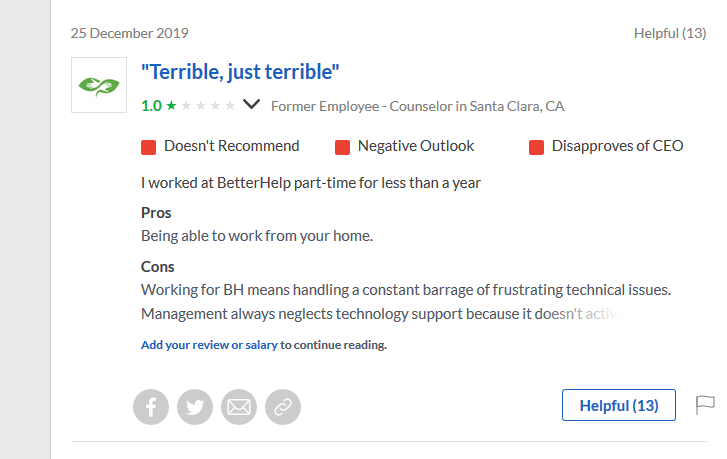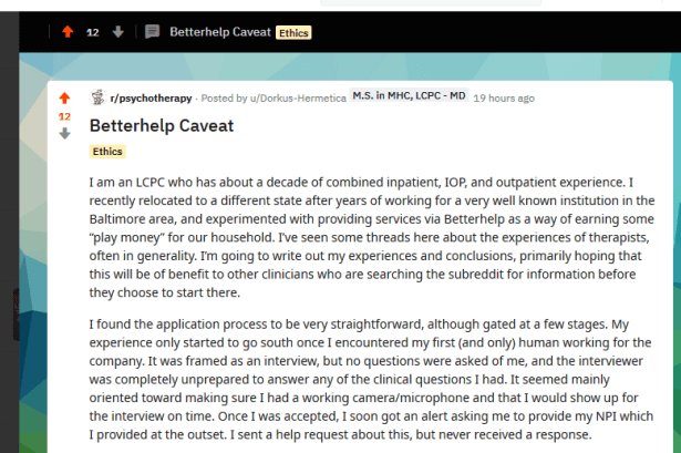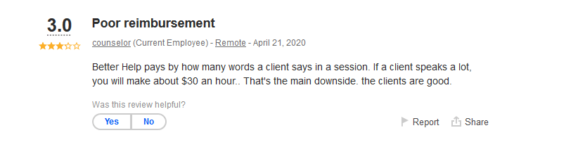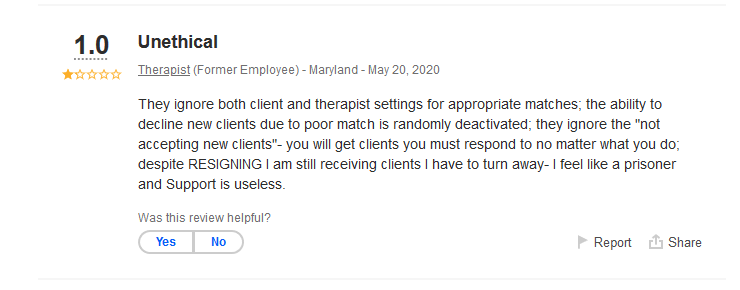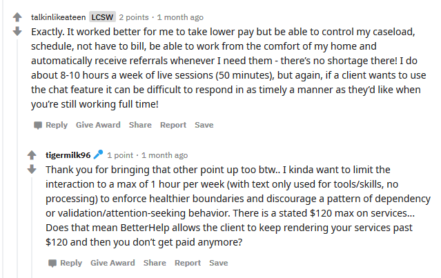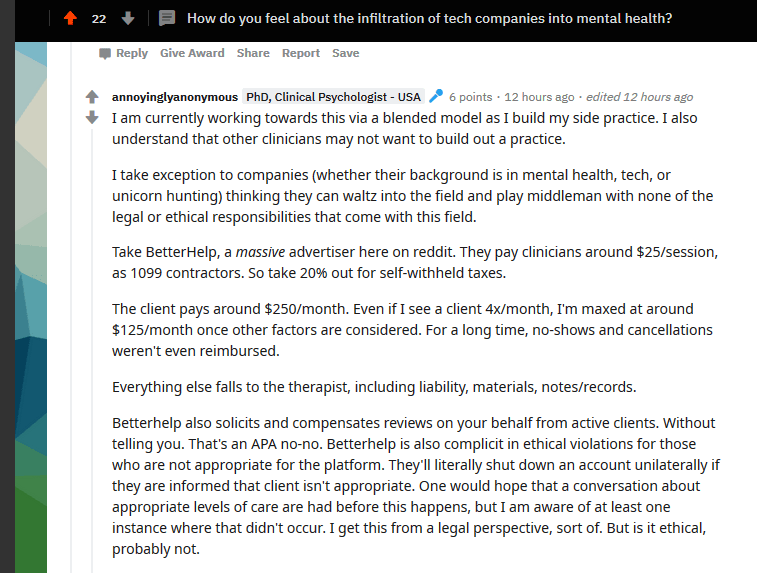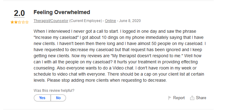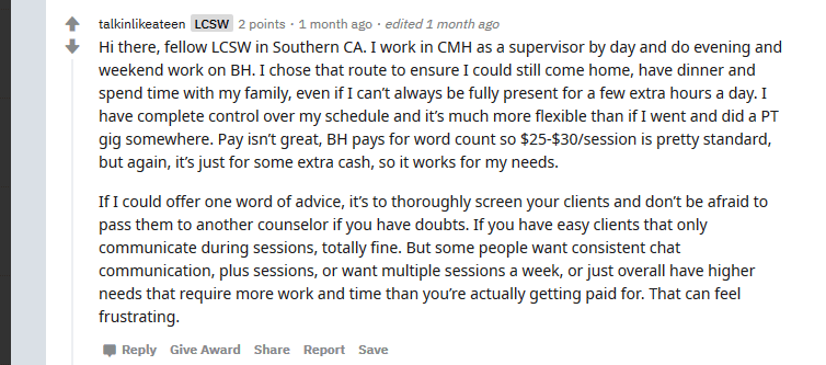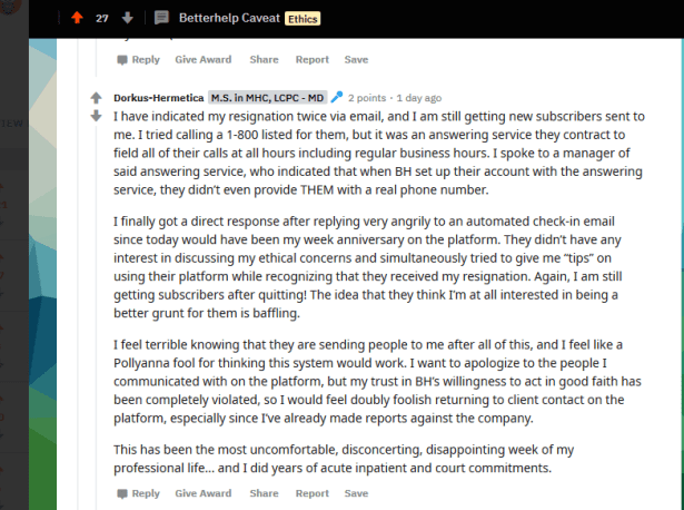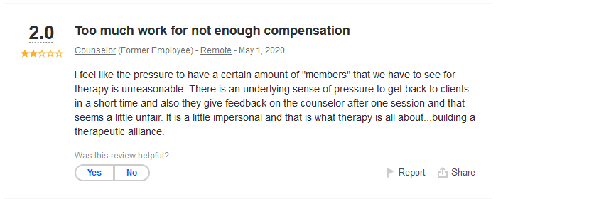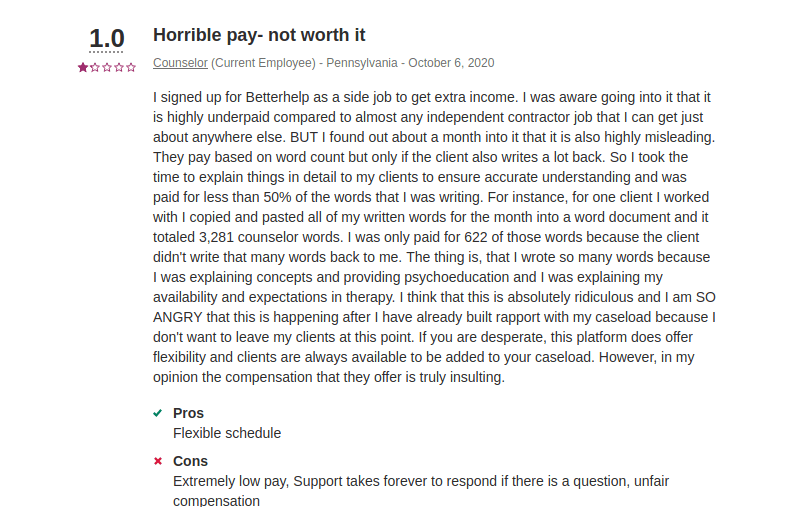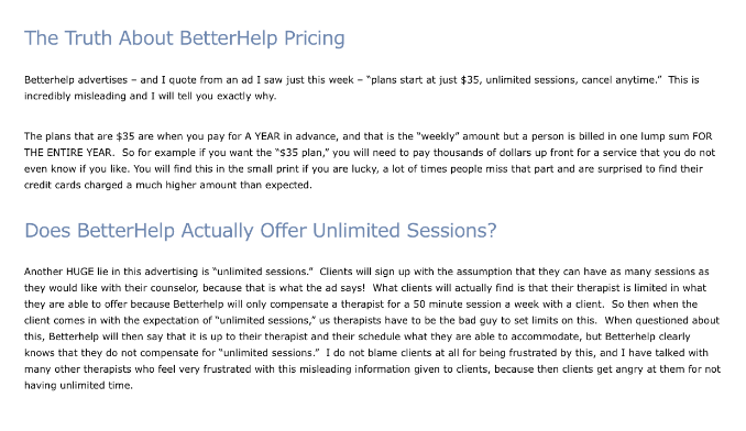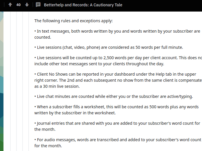 I have detailed this issue in this post. Briefly, BetterHelp pays counsellors for the number of words exchanged with a client, phone or video sessions counting as a certain number of words per minute. It’s all automated, and the content of those exchanges, as well as quality, could not matter less, as their TOS clearly state (SS of TOS regarding services). This was a huge revelation and explained why counsellors sometimes ignore clients after a certain period of time; they’re simply not being remunerated for their work past a certain limit.