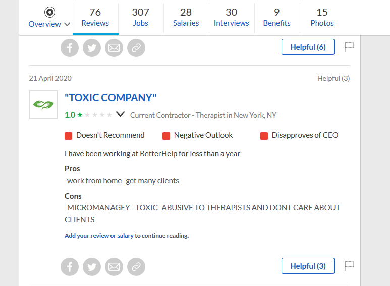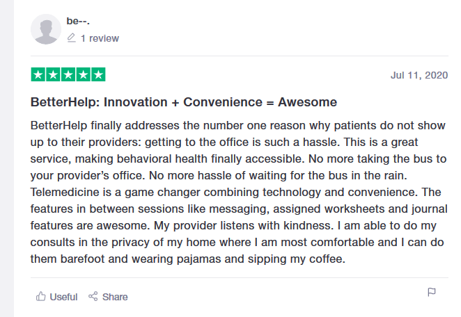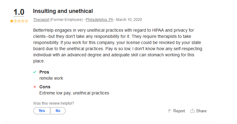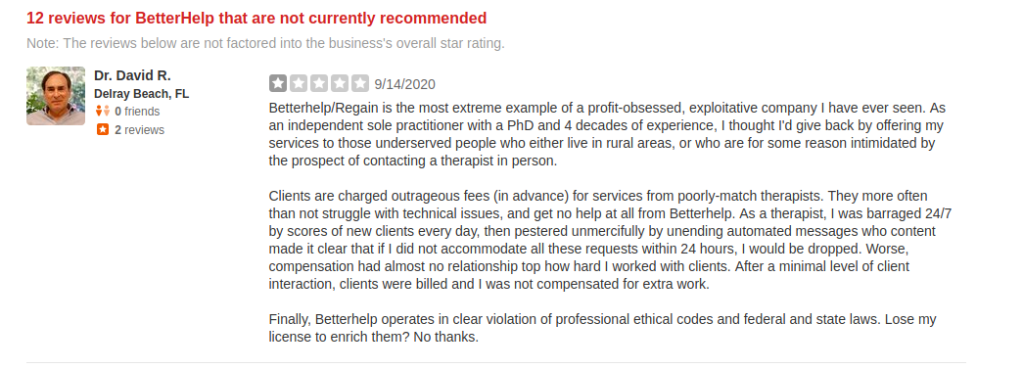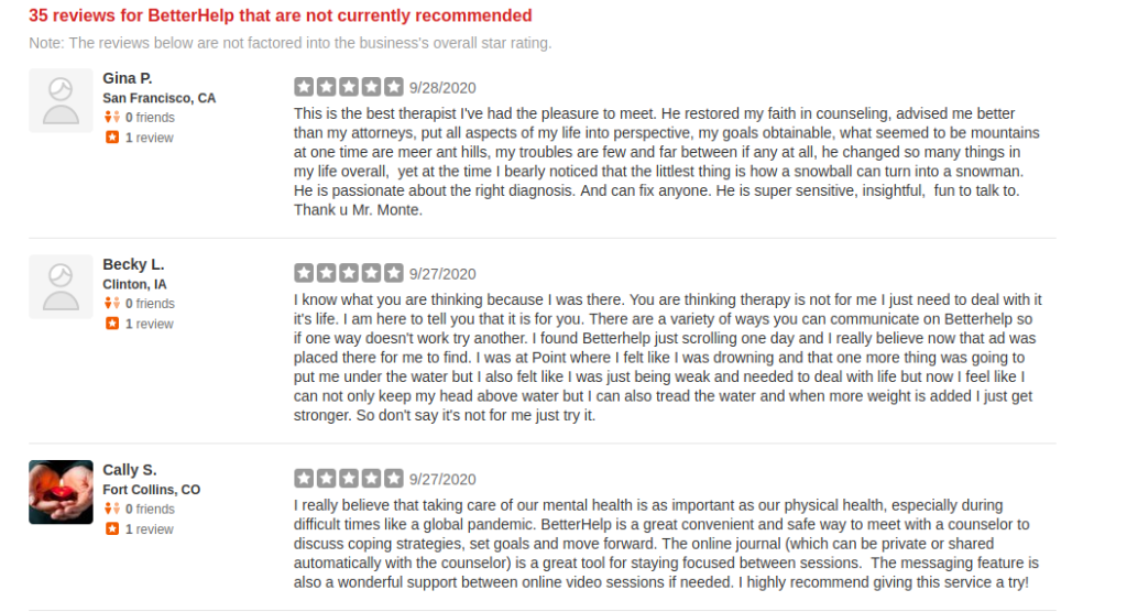For a detailed analysis of this aspect, please see this post. In short, BetterHelp is demonstrably gaming the algorithm on review sites such as Google Play, TrustPilot, Highya, the App Store and most recently, as of September of 2020, Yelp. A regular inspection of their pages shows clear patterns of 5 and 4 star reviews in a row, at times posted on the same day, to counteract the impact of negative ones.