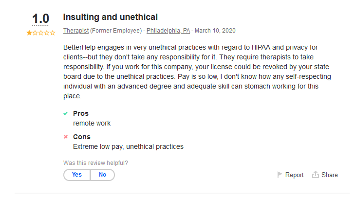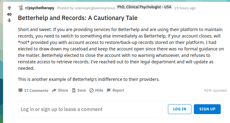 That is to say clients are given an incentive to do marketing for the company in their spare time. In the field of psychotherapy, that is a no-no (getting clients to engage in promotion). Not to mention that should these people be broke and feel they momentarily depend on BetterHelp for assistance, their ability to use the platform (by getting free weeks) might depend on how well they perform in getting new clients for the company. This is unethical and exploitative.