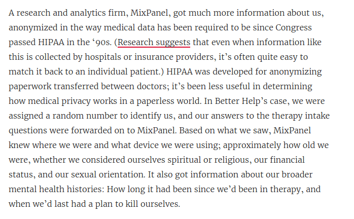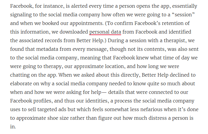 In February of 2020, Jezebel conducted an investigation into BetterHelp’s use of clients’ data, more specifically which third parties it was being sent to in real time, and what exactly was being sent. Please read it, as it’s very revealing.