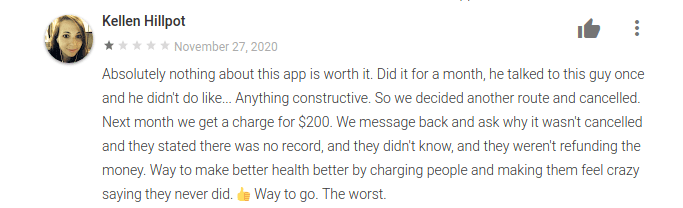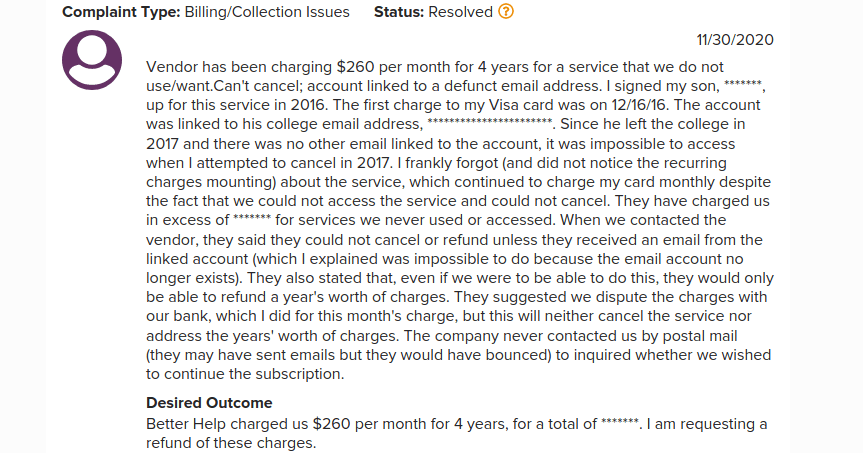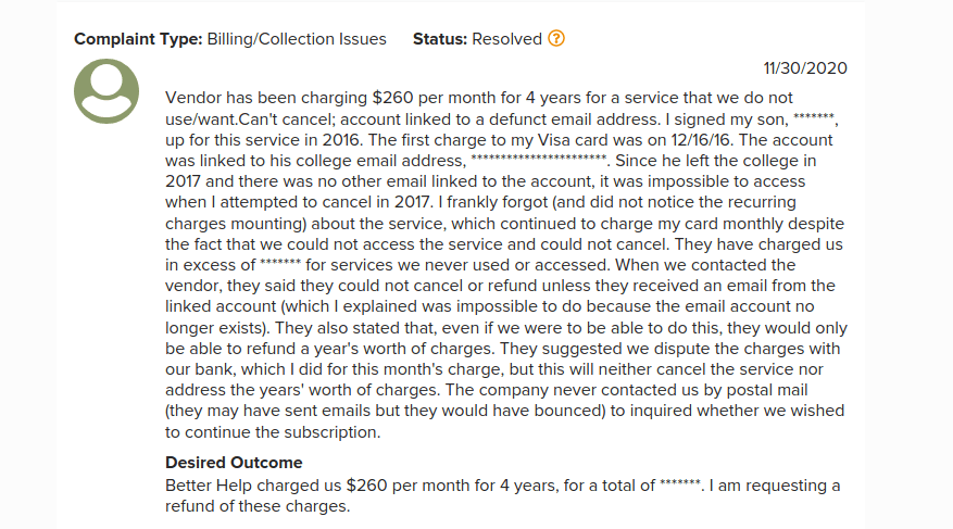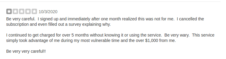 Akin to Berkeley Neutraceuticals when ran by Steven Warshak, BetterHelp seems to have one goal – to get someone’s bank details, start charging them with no warning and no bill, and sometimes, continue to do so even after the service is cancelled. In earlier years, just like the Enzyte scam, they left the client with no option to cancel their subscription single-handedly; they needed a counsellor to cancel it for them. Evidently, the counsellor would often become unresponsive and the subscription would continue, with the client left powerless to stop the charges.