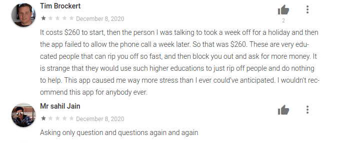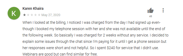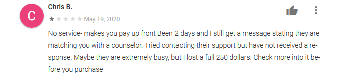 Charging in advance and telling the client services will be greatly delayed, or that no counsellor is available, after leaving them waiting for days. This has been very frequent since the pandemic started. Instead of telling people no one was available, they kept them hanging for days (one person mentioned 11 days) before finally letting them know. Not to mention refunds take up to 10 days as well to process.