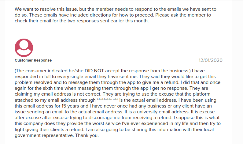 • Making it impossible for clients to reach them directly, except via email, frequently ignoring emails regarding refunds or unauthorised charges;
