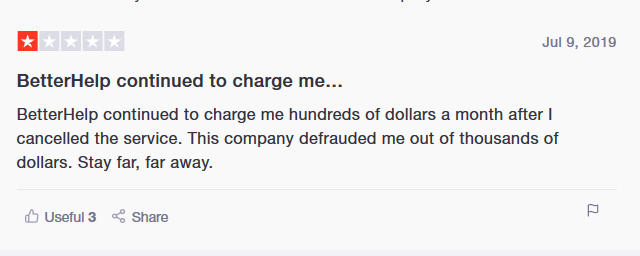 Charging after someone has cancelled the service (quite frequent) . Needless to say, this should never happen, and it’s shocking to see how often it happens with this company. Some people report being charged for months on end after cancelling, and not noticing (since BetterHelp never notifies them when taking their money either).