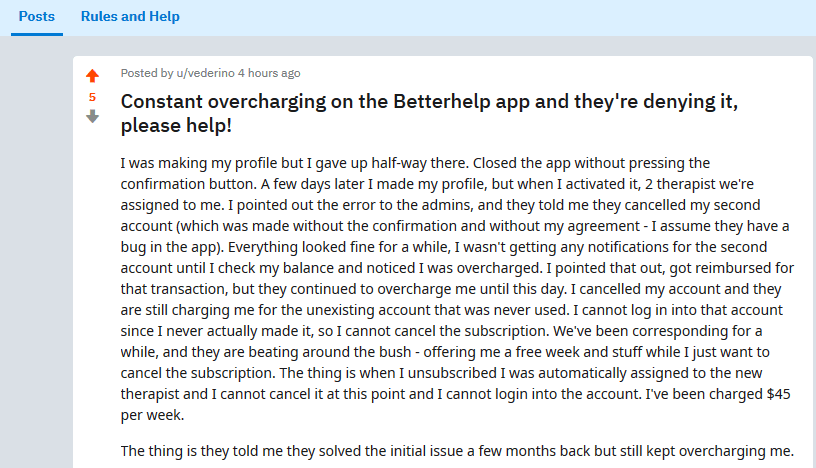 People are often lured by such companies with a free trial. Somewhere in the fine print, one can read that if they fail to cancel, their subscription (and billing) will start automatically. Judging by the number of complaints, this isn’t made obvious. People are accustomed to confirming a paid subscription and authorising any payment, and are taken by surprise when BetterHelp just starts taking their money.