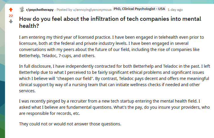 In 2020, a curious phenomenon emerged on Reddit: BetterHelp clients popping up on therapy-related threads, offering their referral links, which would grant them a free week for each new person they got to sign up, one being granted to the new client.