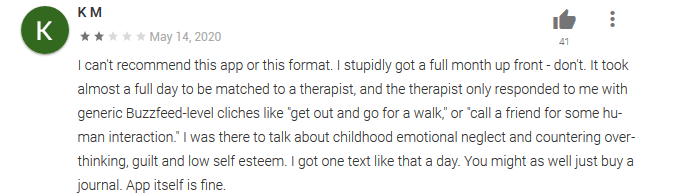 • The ability to text their counsellor at any hour through the app, with no guarantee what they send will be answered or even read at any time; many have compared it to venting into a void.