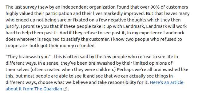 The only valid perspective on Landmark, as you might expect, is the praise of those who have done it and still hold a positive opinion. The rest of the world is comprised of the following: