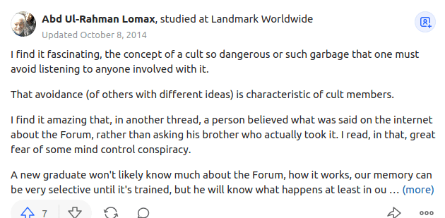 The dismissal below can be found on nearly every thread or article based on a negative view of Landmark, regardless of how someone reached that view (direct experience, the experience of a family member or friend, working for a business dominated by graduates, consistent pestering to join, extensive research etc).