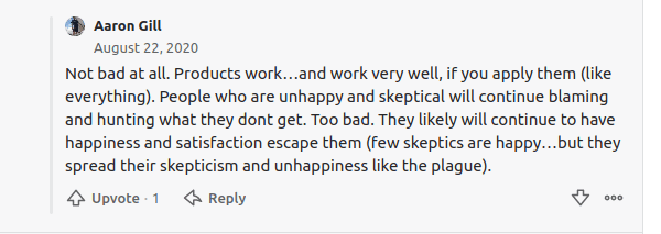 This person is obviously far gone, since they think happiness and satisfaction are impossible to achieve outside of Landmark. Sceptics “spread unhappiness” (the correct way to put it is they dispel a mirage, a delusion, and that’s obviously not welcome).