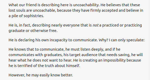 The word “uncoachable”refers to someone who has found Landmark to be utter bullshit (impossible to brainwash). “Uncoachability” doesn’t exist; it’s not a human trait; it’s akin to Scientology referring to someone’s body thetans.