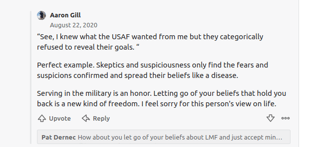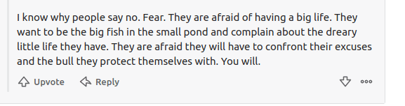 In this person’s mind, “I think I’m being scammed” or “I think this is a cult” somehow translates as someone being afraid of overcoming their limitations and living “bigly”, in the words of an orange clown.