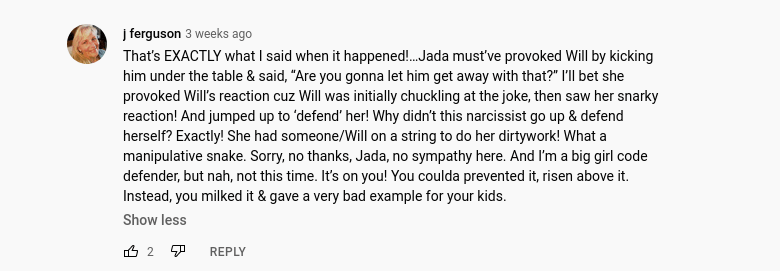Let’s take the recent case of Jada Pinkett Smith, whose failure to laugh at a joke triggered an avalanche of vilification. For the record, I don’t care if she’s an agreeable person or not, or how she handles her marriage and family life. It’s none of my business.