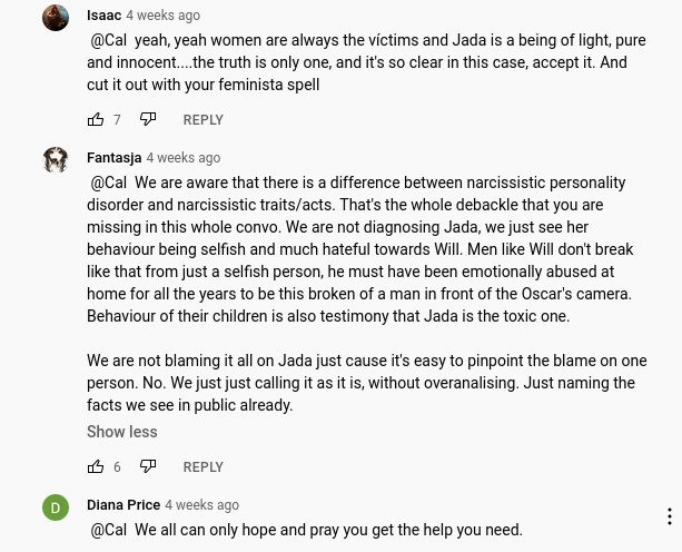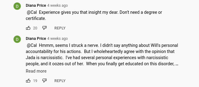 I’m sorry to tell them, but no. Some things their ex-spouses/partners or family members did, that they see reflected in the behaviour of complete strangers, may trigger them – but that’s about it. The following chain of comments displays a typical swarming in a “support group” of this ilk, when these fine people are reminded that in order to diagnose a person, one needs qualifications.