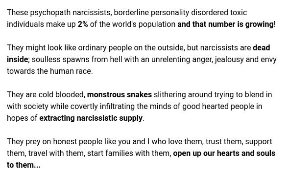 This is the same person typing up said email, referring to people suspected of having NPD or ASPD (many who turn to these types don’t have a diagnosis), as “soulless spawns from hell” and “monstrous snakes”, making you think he was the actual patient.