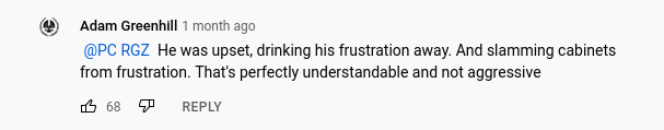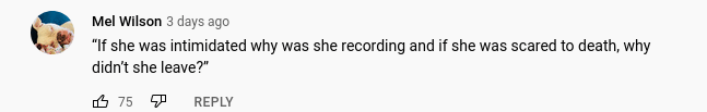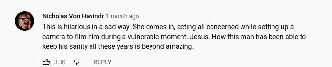 As Mr Rottenborn pointed out, if you record the violence, you are setting someone up. If you don’t record, it didn’t happen. Either way, it’s all about her and her motivations or reactions, not about the raging baboon. His behaviour doesn’t even factor in. Her snickering at the end, after recording behaviour no one might believe had happened save for that recording, is all that matters to them.