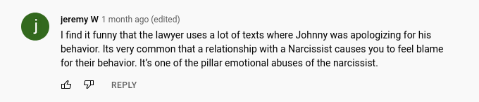 Depp was aplogising after specific incidents he himself had caused, admitting to them at the time. Supposedly, in this person’s mind, every aggressive addict/abuser apologises after a massive blunder because their spouse is a narcissist. There’s no way in hell people ever do for things they actually did.