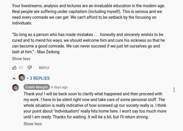 In this post, I briefly detailed how sad communist cult the Center for Political Innovation (CPI) recently imploded: its leader, Caleb Maupin, was revealed to have abused members in various ways, including by exploiting them sexually. Having made some of them destitute didn’t help.