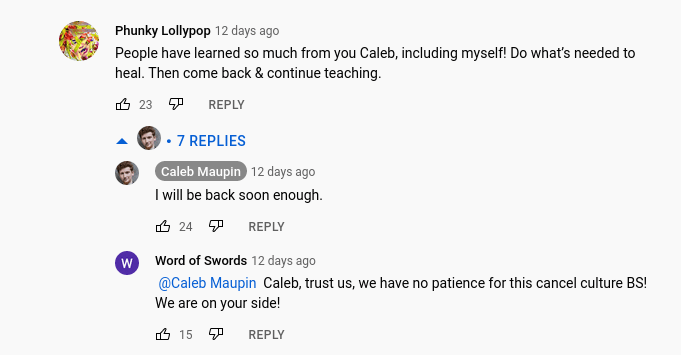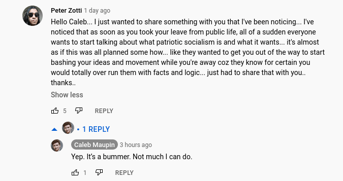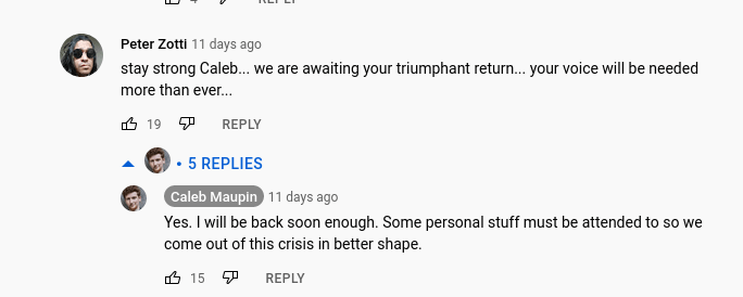 The following is a very recent string of comments Maupin received on his last videos, uploaded before disappearing from public view. They are beyond delusional, and, to no one’s surprise, Maupin discretely encourages them.