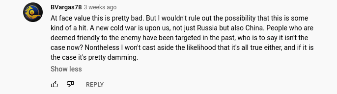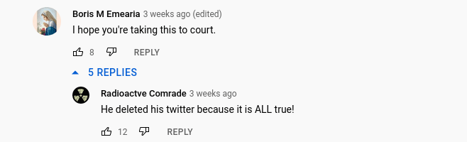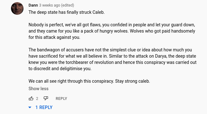 Along with the leader’s imagined importance comes the paranoia that others are out to get him/her/them. The first comment mentions the CIA, whilst the second brings up the deep state. The contrast with reality is incredibly ironic: Maupin was not brought down by powerful enemies, but by his former comrades, some being utterly broke and at least one being temporarily homeless.These are people who at times could not afford to eat, some having to resort to prostitution.