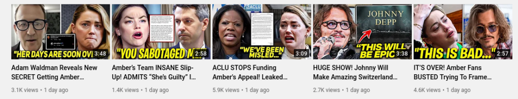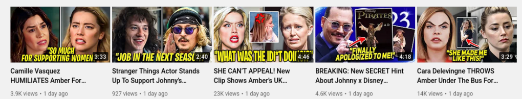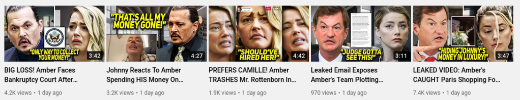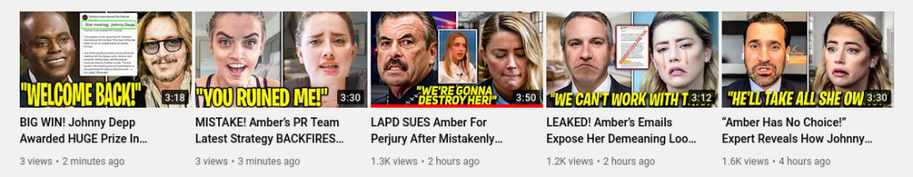 Particularly since the Depp v Heard trial, the explosion of mindless clickbait channels on YouTube has become more obvious. Amber Heard was, of course, not the first target in recent years, a similar phenomenon arising around Meghan Markle and Jada Pinkett Smith. All three women have been the subject of hundreds upon hundreds of defamatory videos making absurd accusations against them, taken by viewers as actual news or commentary, given the engagement they create.