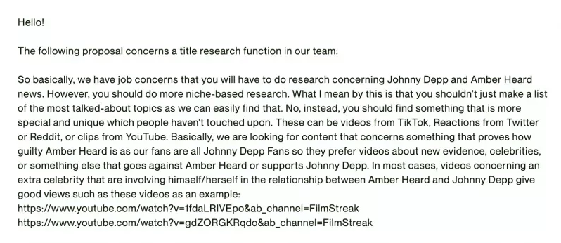 If their intention of misinforming and inciting hatred was not clear enough, a work offer on Upwork, presumably posted by the channel owner, surfaced online. The channel was looking for so-called researchers to come up with 10 salacious, negative titles about Amber each day, for 8 dollars per hour. Why titles only? Well, it may be because the content of the videos is usually unrelated to the title, making each video 100% clickbait.