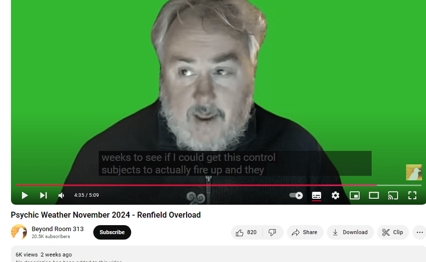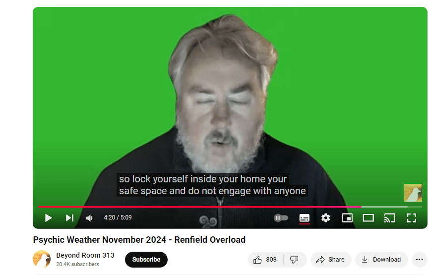 Recently, with a sense of urgency, Sheridan claimed the streets were full of “Renfields” and followers should lock themselves inside their homes to avoid them. He had observed it directly (strangers had been rude to him in public or something) and had concluded that the psychic weather of the planet had changed. Followers were now at risk of interacting more frequently with these humanoids, at their own peril.