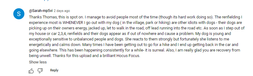 As an example of perceived renfielding, this paragraph, apparently, doesn’t depict the occurrence of dogs barking at each other in the street, as they are known to; their owners are by default Renfields. It’s main character syndrome – those randos, inconsiderate or not, were not there simply to walk their own dogs, as the author of the comment was, but specifically to annoy her, as a cosmic joke.