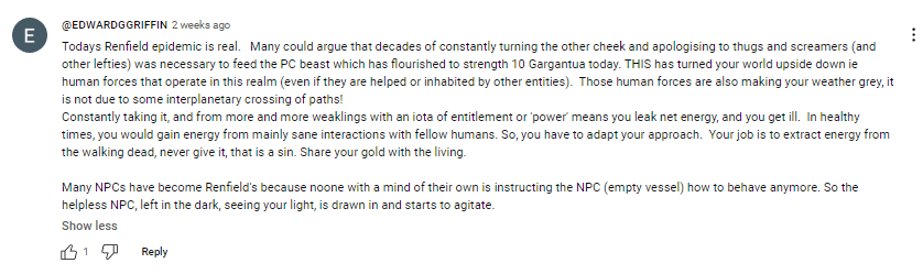 It’s hard to discern how Renfields differ from the other made-up enemies of the Tribe, such as NPCs or normies. From what I gather, Renfields are unstable and have behavioural issues in their immediate environment; however, there’s a substratum of brainwashing behind it. Sheridan came up with the verb “renfielding”, which he doesn’t detail and must be loaded language, only understood by members. As you can see in comments below, just about any bothersome behaviour can lead to this label and instant dehumanisation.