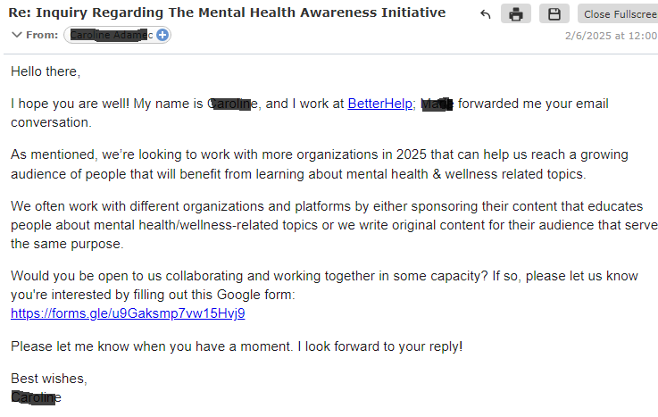The only explanation for such an offer ending up in my inbox is the process being handled by bots scouring the internet for any reference to BetterHelp, approaching websites en masse.