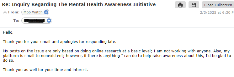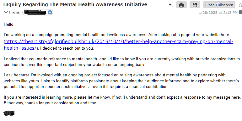 Someone can be forgiven for thinking the sender could be part of a campaign seeking to raise awareness about companies exploiting mental health problems, as they appeared to find that post relevant. Perhaps they were seeking to create a network of sites sharing information and publishing content based on it. It was a “project” and a “campaign”. Nothing to do with promoting a service for profit.
