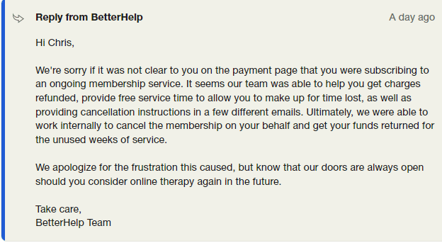 The sender (most likely non-human) not only failed to disclose any relationship to BetterHelp, but included a link which referred to the company as a “scam preying on mental health issues”. The language read a bit corporate, which should’ve been obvious. It wasn’t; perhaps I was too tired from my day job, which doesn’t involve scamming people.