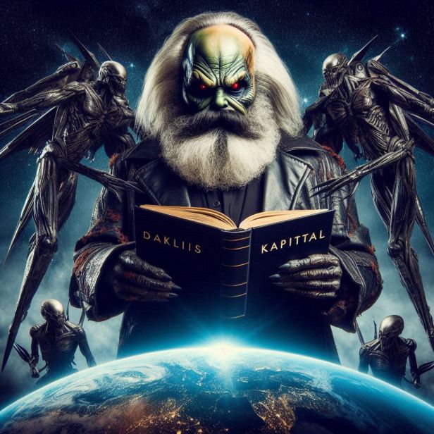 The image is an AI rendition of the nonsense he was spouting. Sometimes it’s useful to transpose absurd ideas into images, to showcase just how absurd they are. There you have it. Interdimensional Marxist aliens.