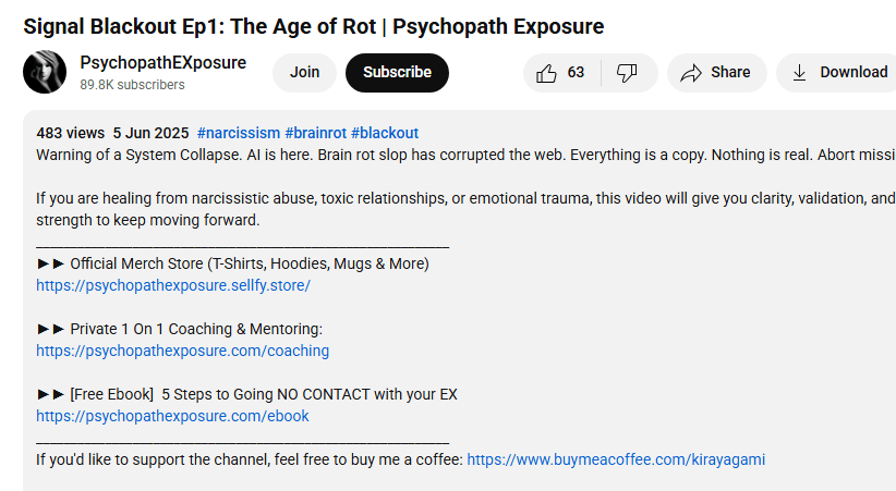 The channel owner’s mention of “brain rot slop” is ironic, since his content is precisely that. Row upon row upon row of drivel designed to keep uploading. He has no psychology studies, does not reference any, has nothing new or relevant to add, yet he keeps making videos on this almost daily.