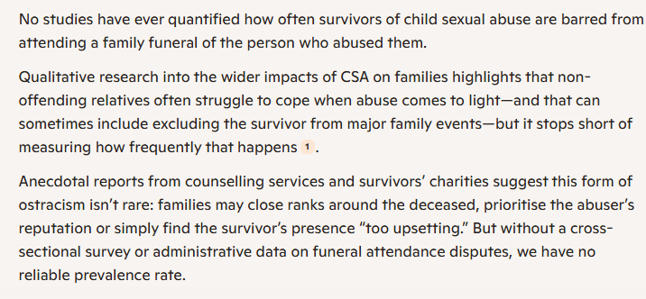 Ironically, the funeral announcement included the words “devoted father”, while most of his children were banned from attending. More ironically, allowing them to briefly be there, to say goodbye, would’ve spared the need to make things up. They were obviously trying to cover up the circumstances of his demise. His children had not outed him publicly and had no intention of doing so. Implying that they would, or that they intended to cause trouble because they had reported abuse, was just another facet of victim demonisation.