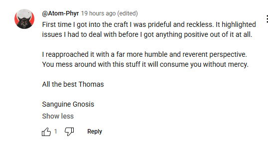 Here’s someone who jumps to the assertion that they had done so on purpose (by the way, Sanguine Gnosis seems to be cult jargon, as some members end their comments with this phrase). I forgot to mention Sheridan designed a symbol for the cult to use, now using it himself as a profile picture on YouTube, encouraging followers to print it and display it in their homes, or even tattoo it on themselves, which I have no doubt some will.