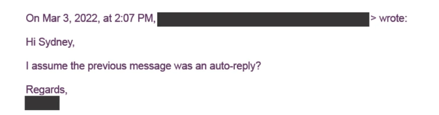 The victim’s niece replied to this Sydney character, who never even acknowledged the content and seriousness of the email.